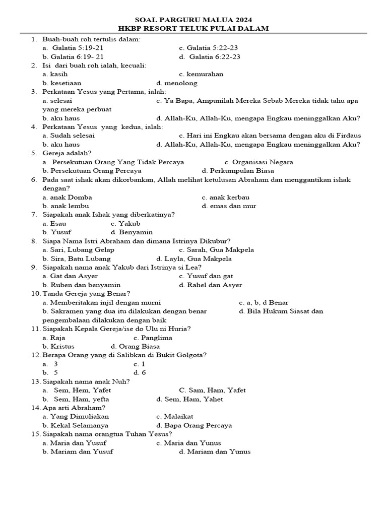 - Pilihan Ganda: Menguji pengetahuan faktual tentang Alkitab, sejarah, dan doktrin.